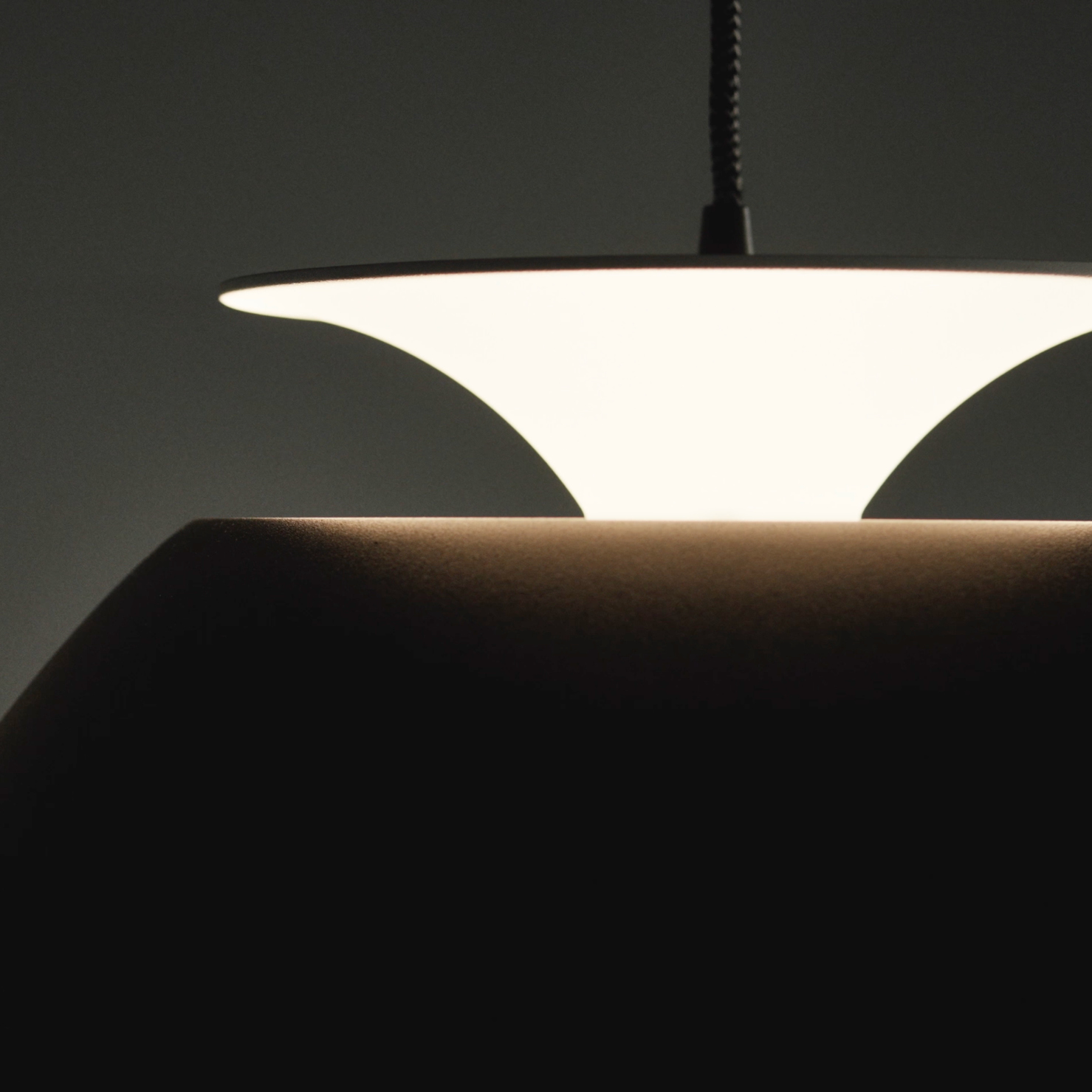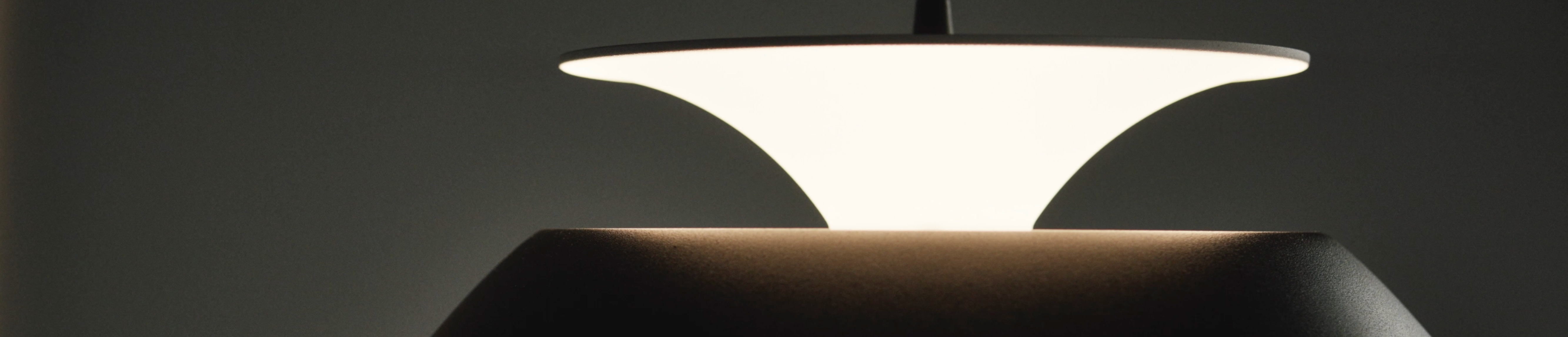 o desenho da luminária e-cone nasce do contraste entre um cone e uma esfera, criando um equilíbrio entre forma e função