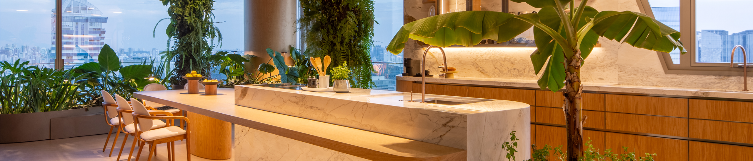 vista para a cidade e ambientes integrados são destaque do apartamento heritage, iluminado por seleção de luminárias da lumini. pendentes ufo cobre na sala de jantar, portátil jazz no living, luminária de parede led it be no quarto, pendente linea no home office e luminária de parede bauhaus ao lado de poltrona de leitura são algumas das escolhas do arquiteto andré luque para o projeto, que também conta com luminárias neo e perfis led line em sua iluminação.